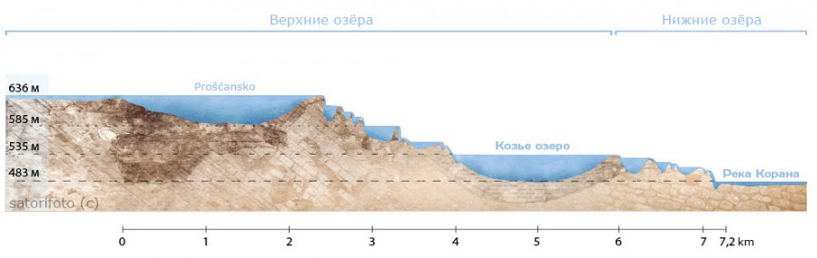 Парк насчитывает 16 озер, которые можно разделить на «Верхние озера» и «Нижние озера». Нижние озера имеют иное геологическое происхождение, поэтому их и отделяют от верхних: верхние озёра лежат на мягко спускающихся в воду отрогах гор доломитовой породы, тогда как нижние находятся в глубоких каньонах известнякового происхождения.